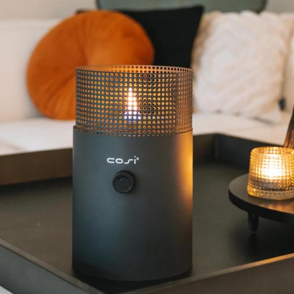 De nieuwste toevoeging aan het Cosiscoop assortiment is de Cosiscoop Dot. Deze unieke lantaarn, in de kleur antraciet, heeft een metalen top met ronde uitsparingen. Dit zorgt voor een mooie verdeling van het licht zodra de dansende vlam aan gaat.