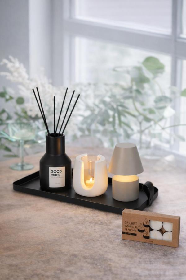 Dit zorgvuldig samengestelde pakket combineert zachte verlichting, een warme geur en stijlvolle accessoires. Het zwarte dienblad vormt de basis waarop de geurstokjes, kaarsen en het lampje samen een rustige en luxe uitstraling creëren.