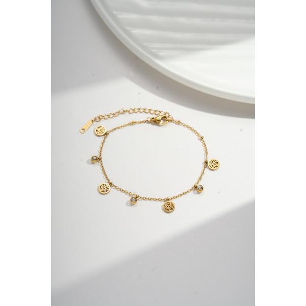 Laat uw energie spreken met deze verfijnde gouden roestvrijstalen armband, versterkt door kleine levensboom van hangers. Symbool van geluk, balans en vernieuwing, het verlicht elke pols met elegantie. Een trendy juweel, bestand tegen water, om dagelijks te dragen of met liefde aan te bieden.