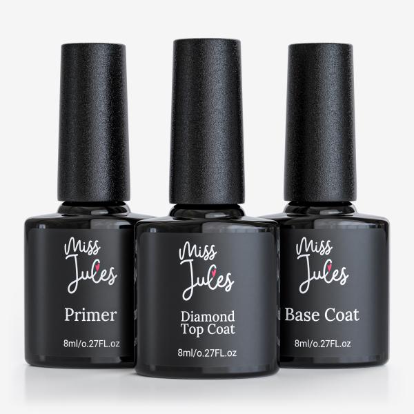 Wil jij de beste voorbereiding voor je nagels? Of je nu werkt met BIAB, Polygel of Gellak, deze Miss Jules Primer, Base Coat & Top Coat complete set zorgt voor een goede hechting en behoud de glans van jouw nagels.