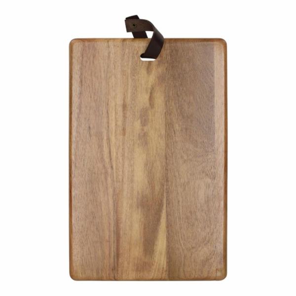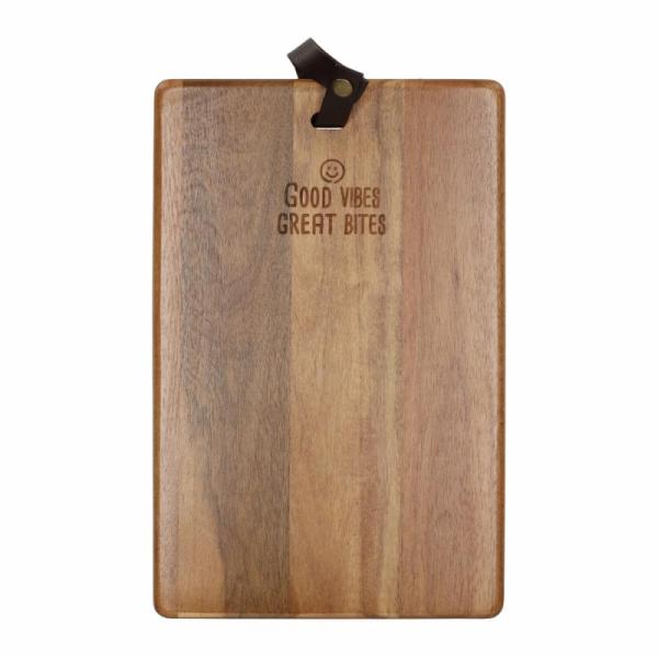 Deze acacia houten serveerplank brengt direct sfeer aan tafel. Het natuurlijke hout en het leren koord geven een warme, rustieke uitstraling, terwijl de gegraveerde tekst 'Good vibes, great bites' zorgt voor een vrolijke touch. Perfect voor het serveren van kaas, brood of kleine hapjes. Dit artikel is niet vaatwasser bestendig. Voor langdurig behoud van het hout kun je de plank het beste met een licht vochtige doek reinigen.