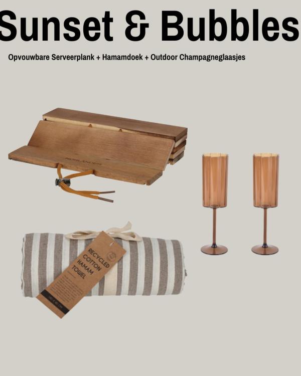Dit zorgvuldig samengestelde pakket bevat een opvouwbaar borrelplankje, een luxe hamamdoek en elegante outdoor champagneglazen in een warme amberkleur. De kleuren zijn mooi op elkaar afgestemd en geven het pakket een rustige en luxe uitstraling. Zo ontstaat een cadeau dat niet alleen praktisch is, maar ook direct sfeer brengt.