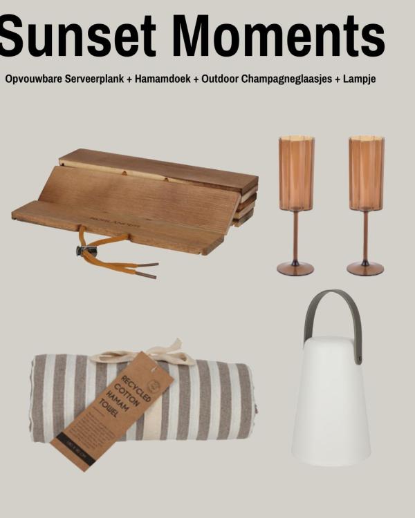 Het borrelplankje is ideaal om hapjes te presenteren, de zachte hamamdoek zorgt voor comfort tijdens een avond buiten en met de outdoor champagneglazen kan er overal veilig geproost worden. Het tuinlampje maakt het moment compleet en zorgt voor een warme, gezellige sfeer zodra de zon ondergaat.